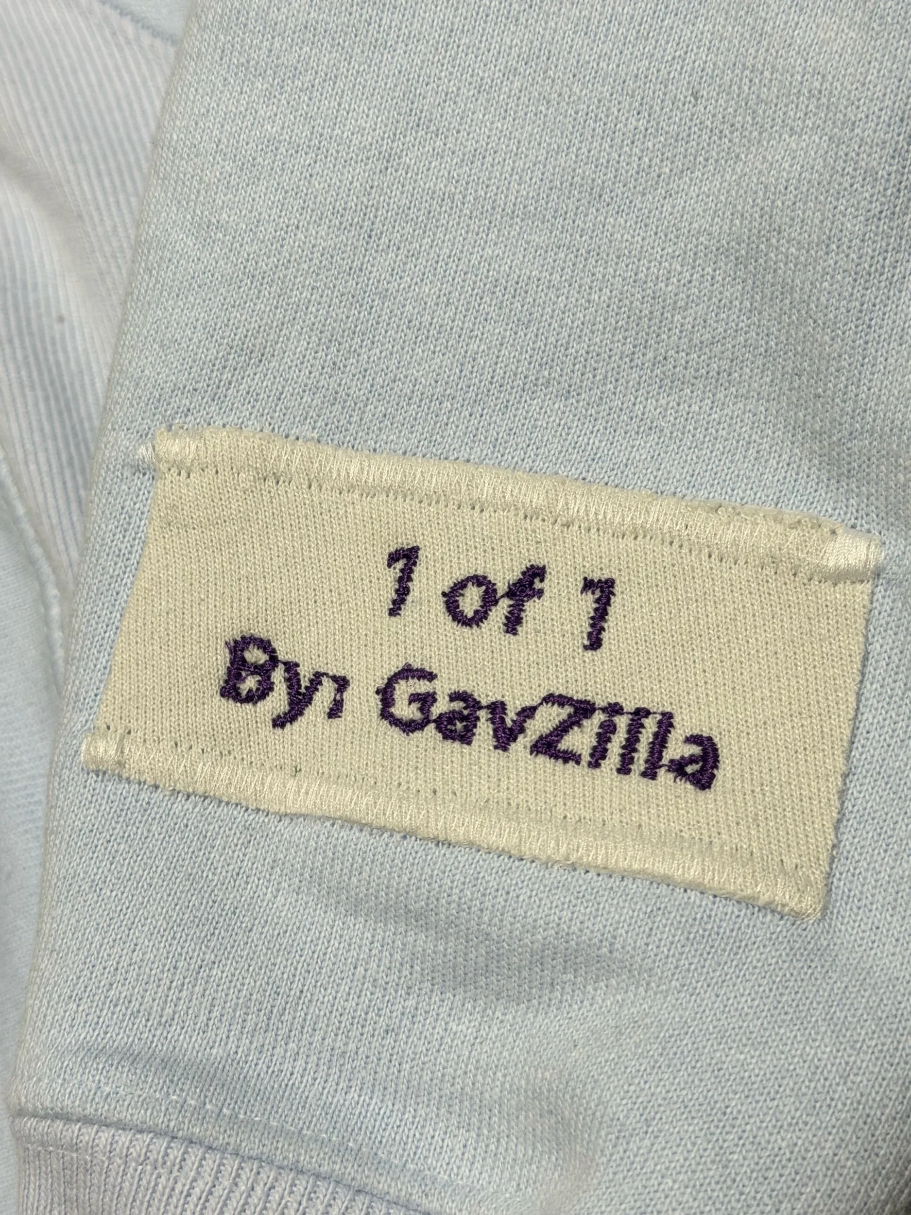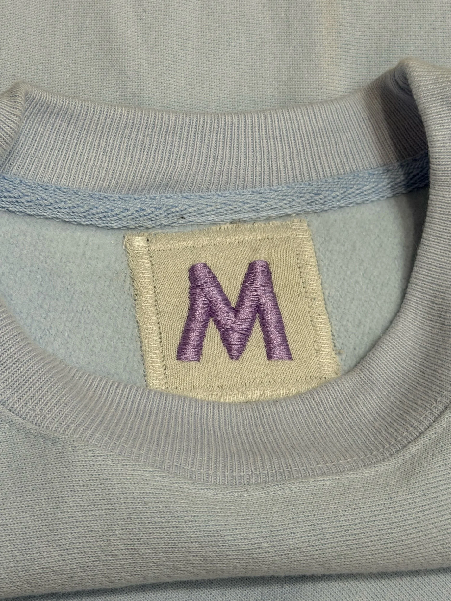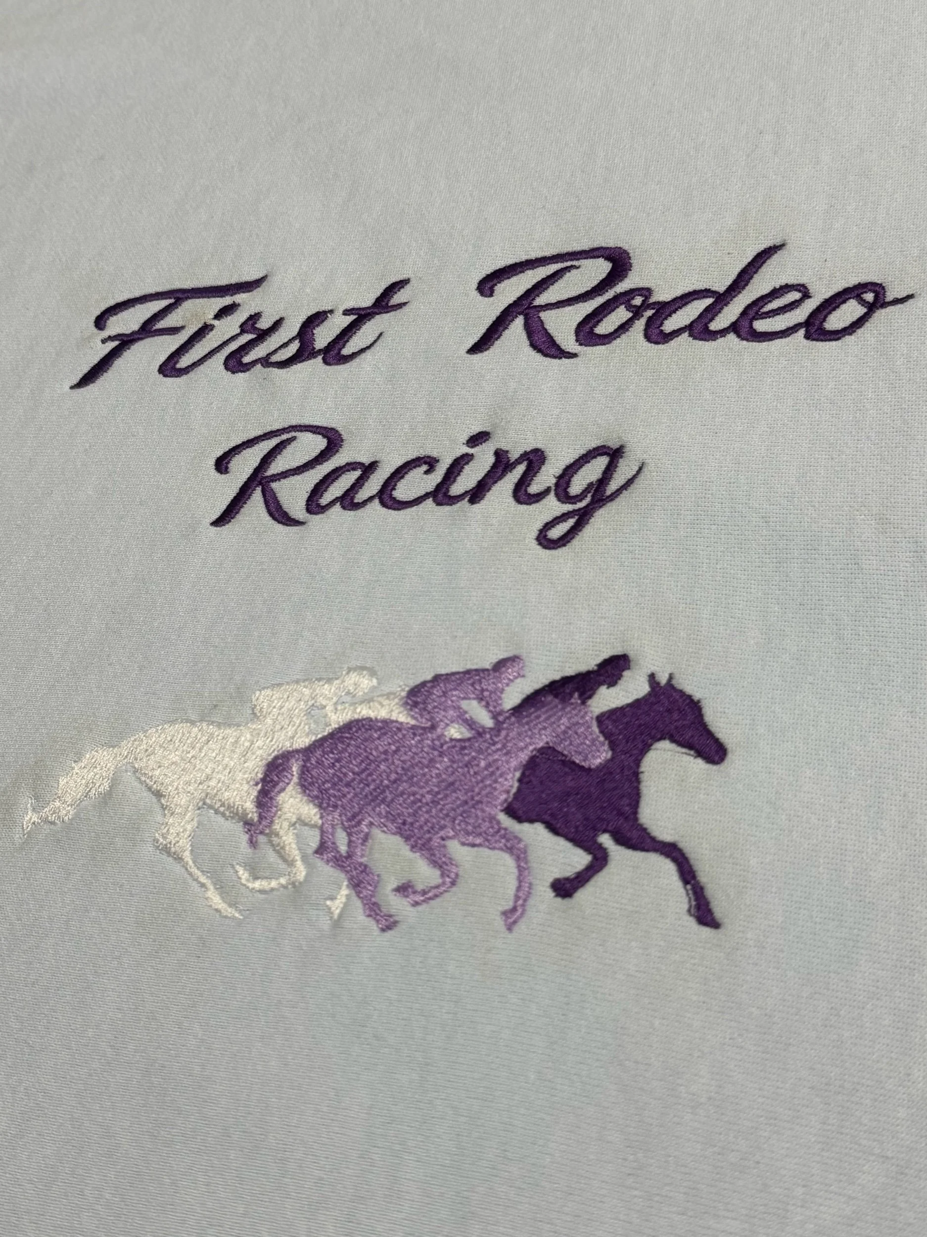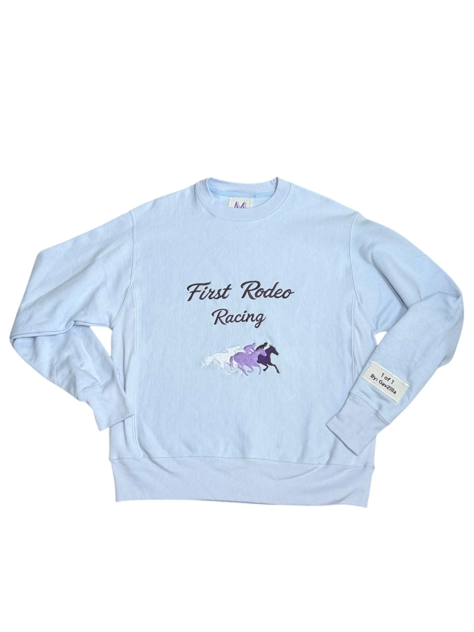 Size. M- This 1 of 1 FRR crewneck features a violet First Rodeo Racing script embroidery, with a tri-color horse racing embroidery on the front.