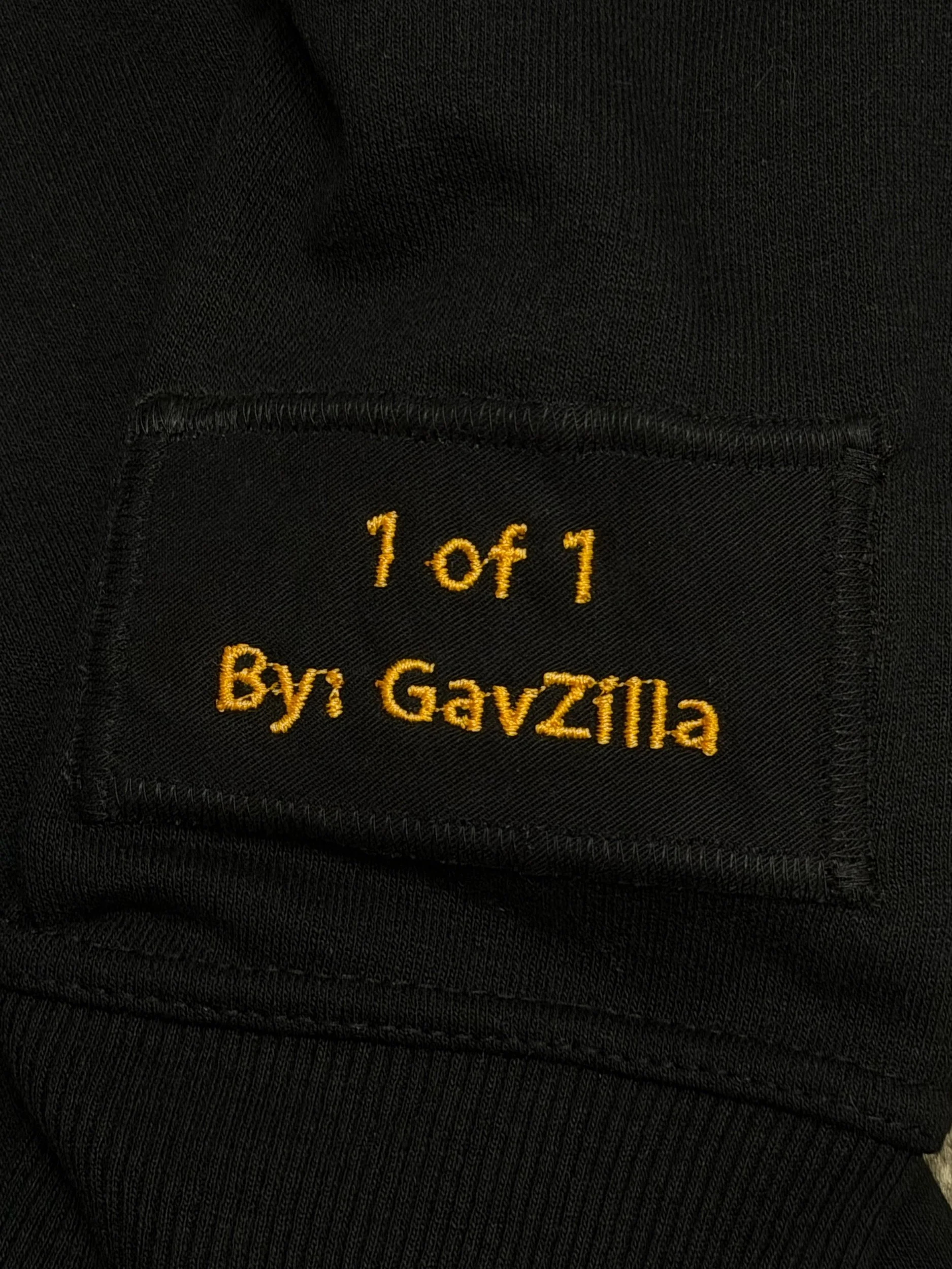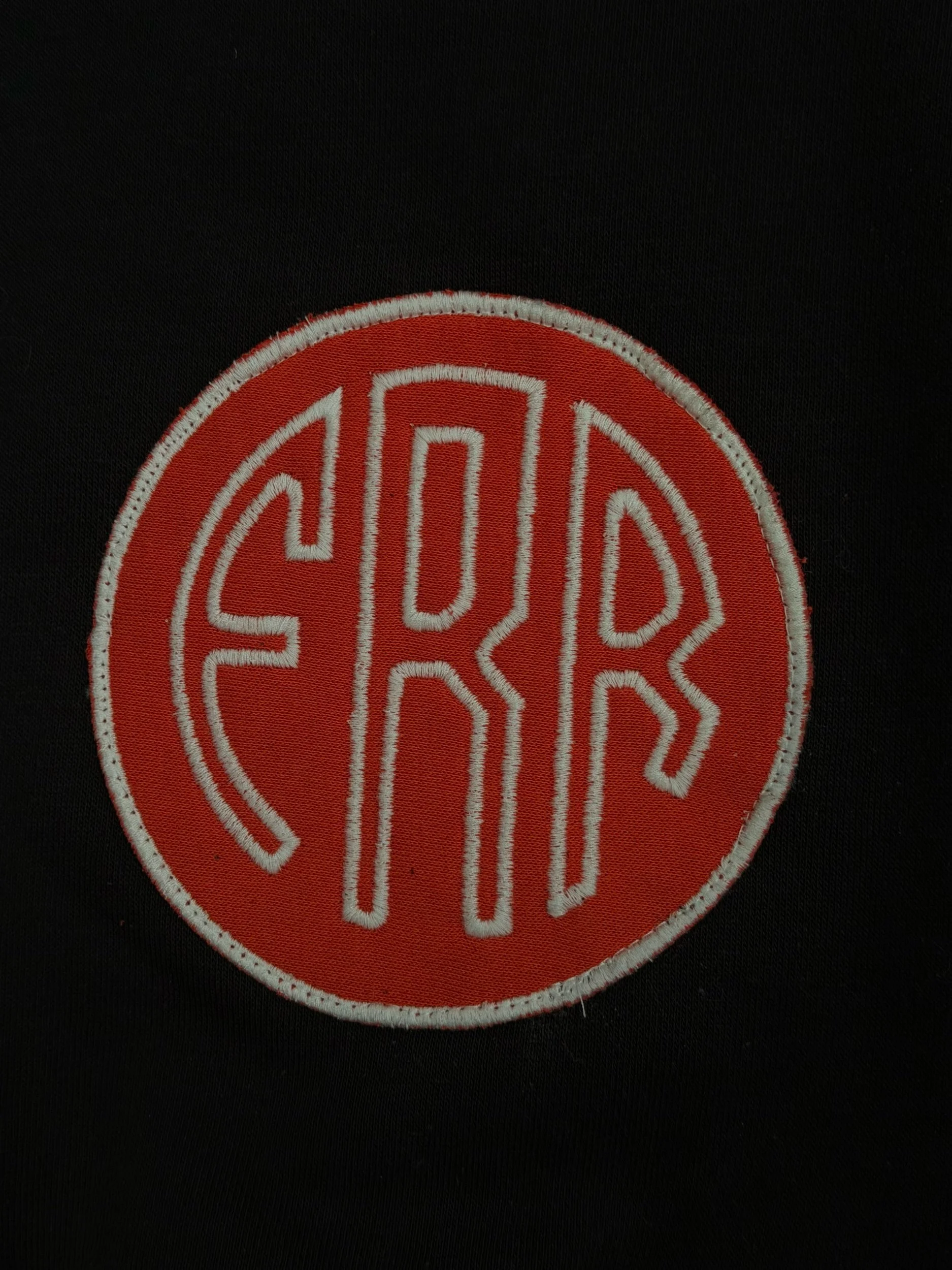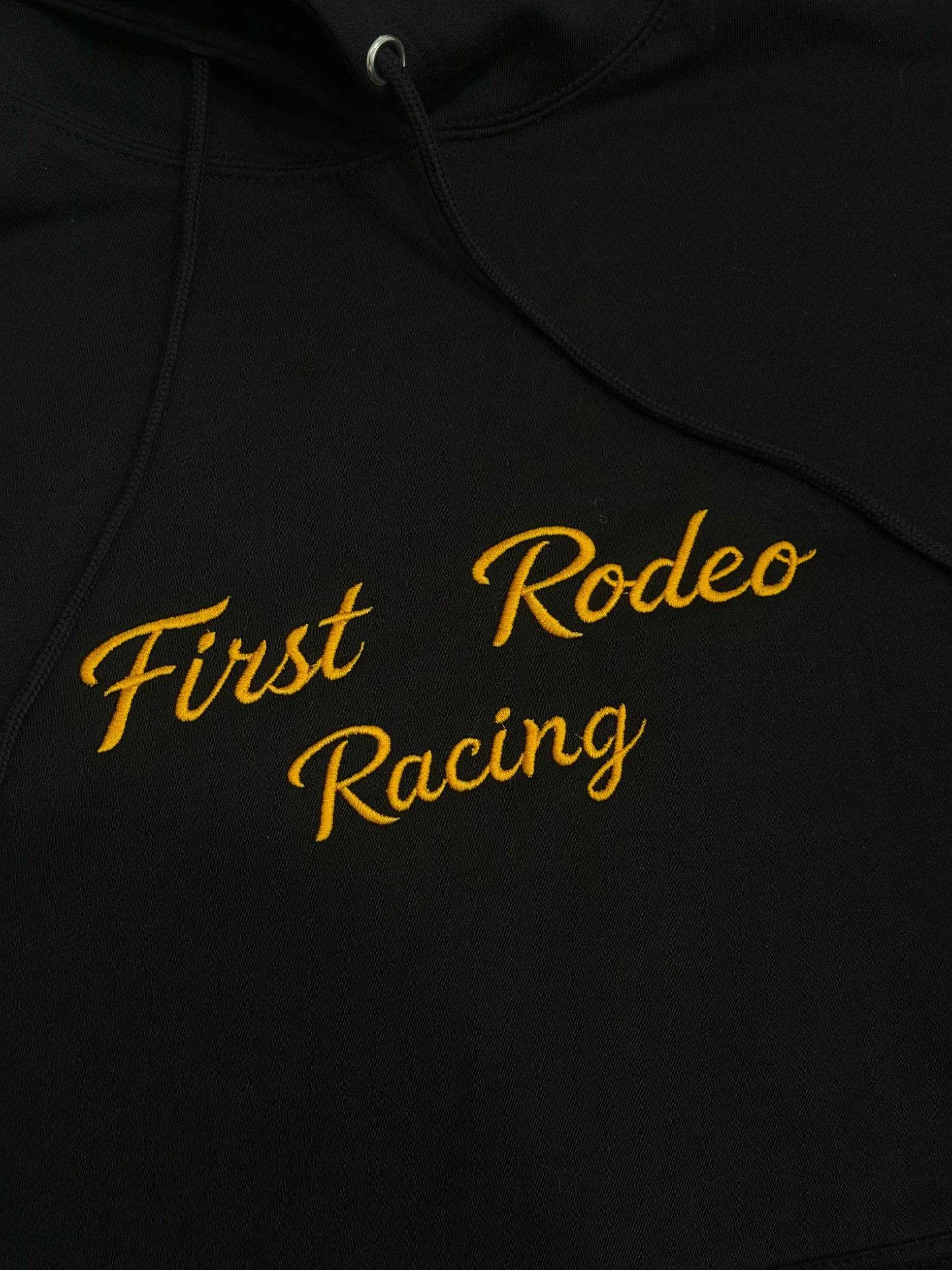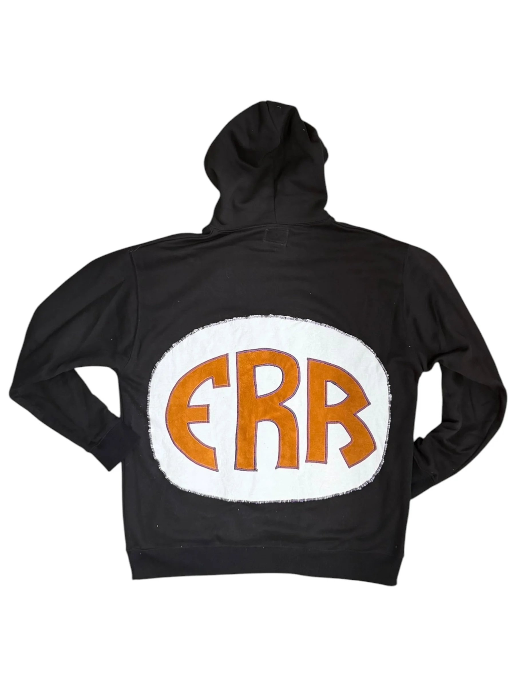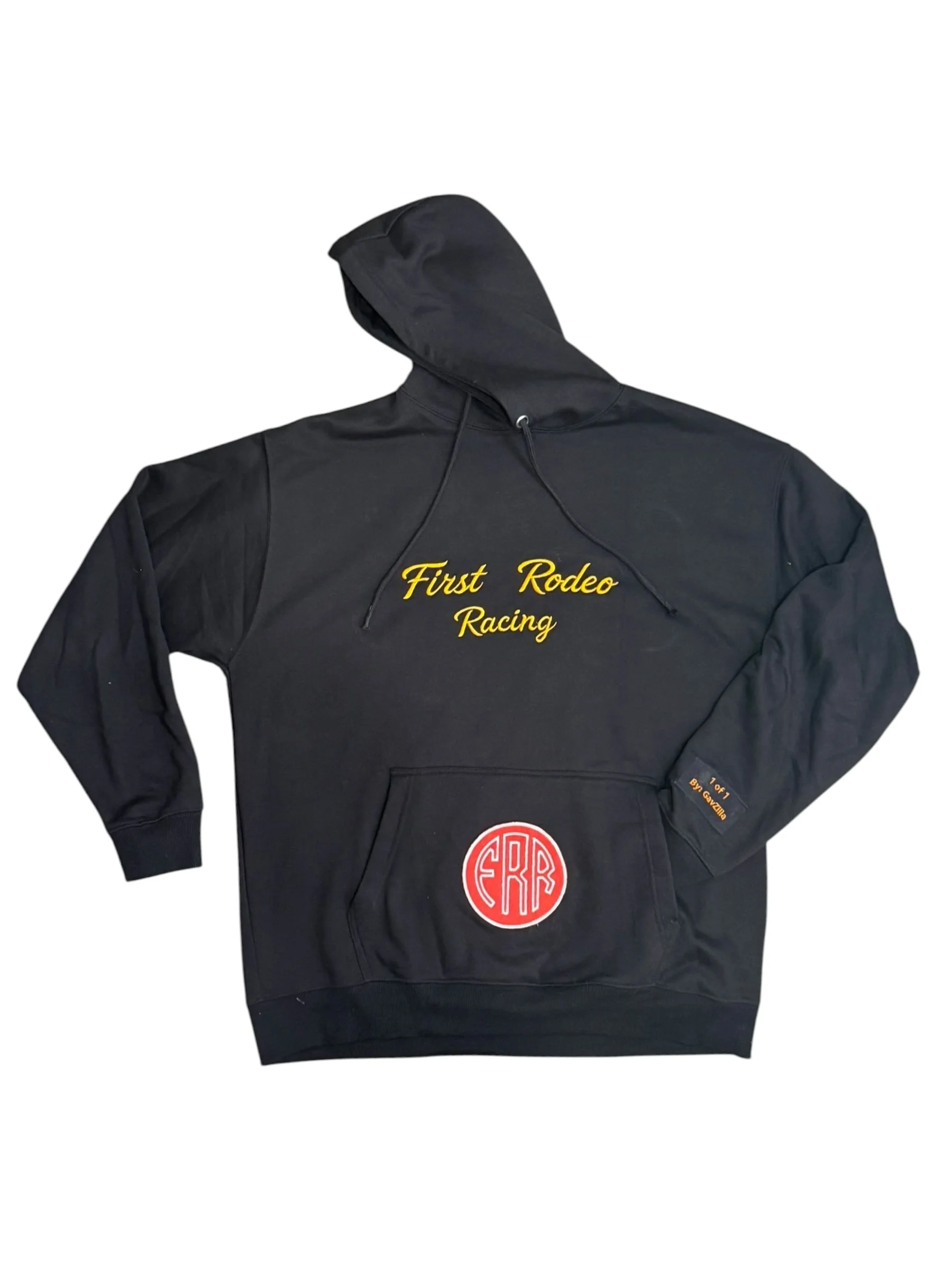 Size. XL- This 1 of 1 FRR hoodie features a classic one color First Rodeo Racing script embroidery, FRR appliqué patch on pocket, and a huge hand made FRR patch on the entire back of the hoodie.